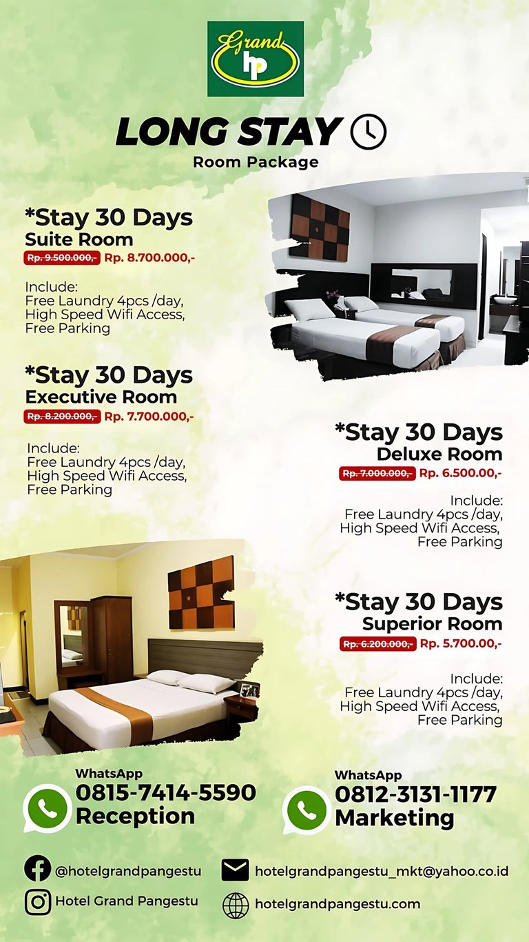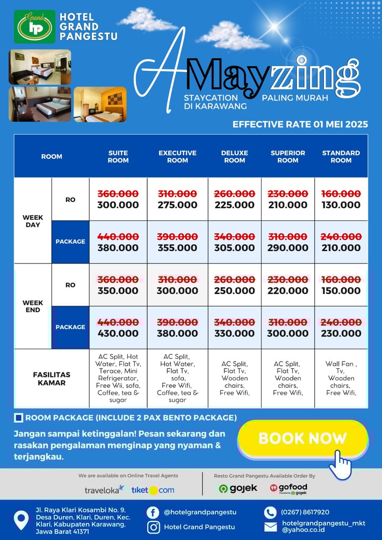 Staycation hemat? Cuma di Hotel Grand Pangestu! Mulai dari Rp130.000, Anda sudah bisa menikmati kamar nyaman, Wi-Fi gratis, dan layanan kamar 24 jam. Dekat stasiun, jadi nggak ribet! Buruan booking sebelum kehabisan!