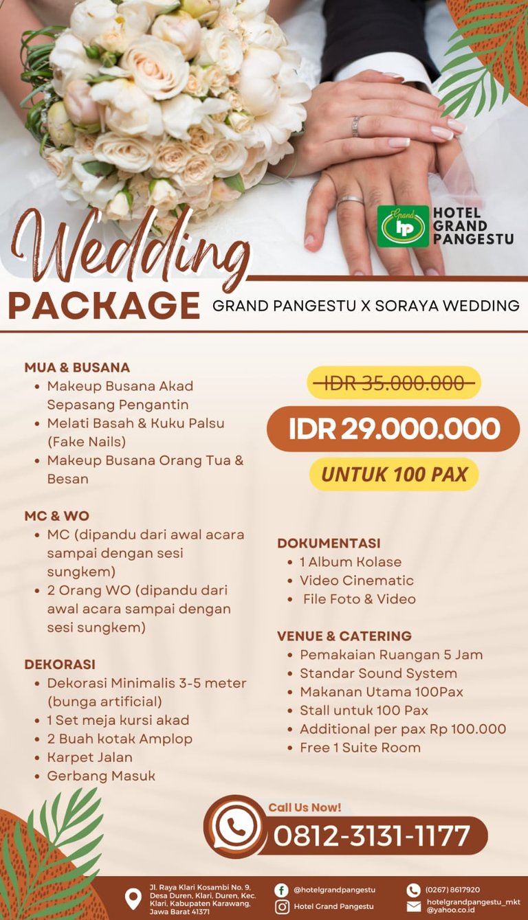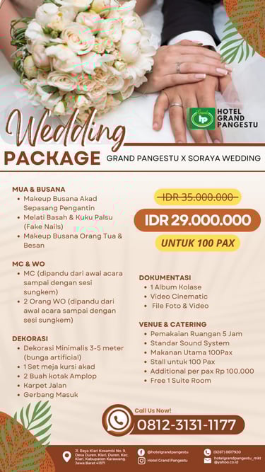 Rayakan hari bahagia Anda dengan paket pernikahan istimewa dari Grand Pangestu dan Soraya Wedding! Nikmati kemewahan dan kenyamanan di venue kami dengan penawaran spesial harga hanya IDR 29.000.000 untuk 100 tamu. Paket ini mencakup layanan MUA & busana, MC dan WO, dekorasi menarik, serta dokumentasi yang lengkap. Semua dirancang untuk membuat momen berharga Anda tak terlupakan. Jangan lewatkan kesempatan ini, hubungi kami segera di 0812-3131-1177 dan mulailah merencanakan pernikahan impian Anda sekarang!